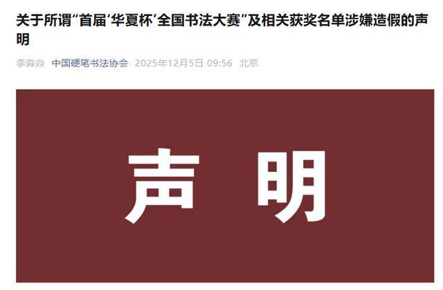 “中国硬笔书法协会”微信公号12月5日消息,针对近日网络中“首届‘华夏杯’全国书法大赛”相关信息的传播,中国硬笔书法协会12月4日发布声明: