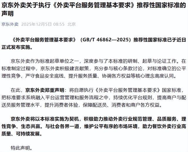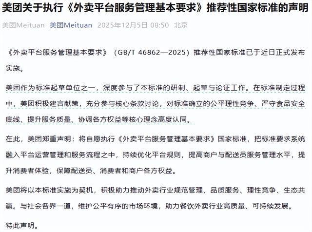 近日,美团、京东外卖、淘宝闪购分别发布关于执行《外卖平台服务管理基本要求》推荐性国家标准的声明: