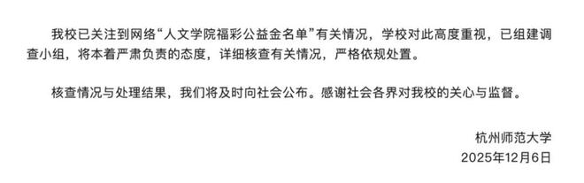 我校已关注到网络“人文学院福彩公益金名单”有关情况,学校对此高度重视,已组建调查小组,将本着严肃负责的态度,详细核查有关情况,严格依规处置。核查情况与处理结果,我们将及时向社会公布。感谢社会各界对我校的关心与监督。