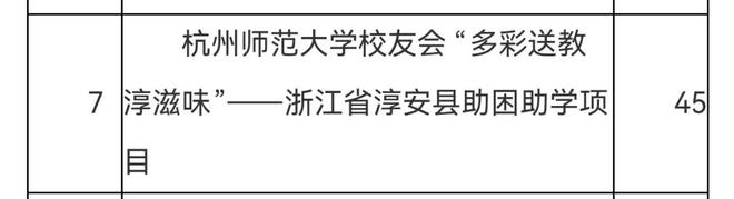 据浙江省民政厅官网,其2023年6月30日公示了2022年浙江省省级用于社会福利事业彩票公益金使用情况,其中载明,杭州师范大学校友会 “多彩送教淳滋味”——浙江省淳安县助困助学项目,资助金额45万元。