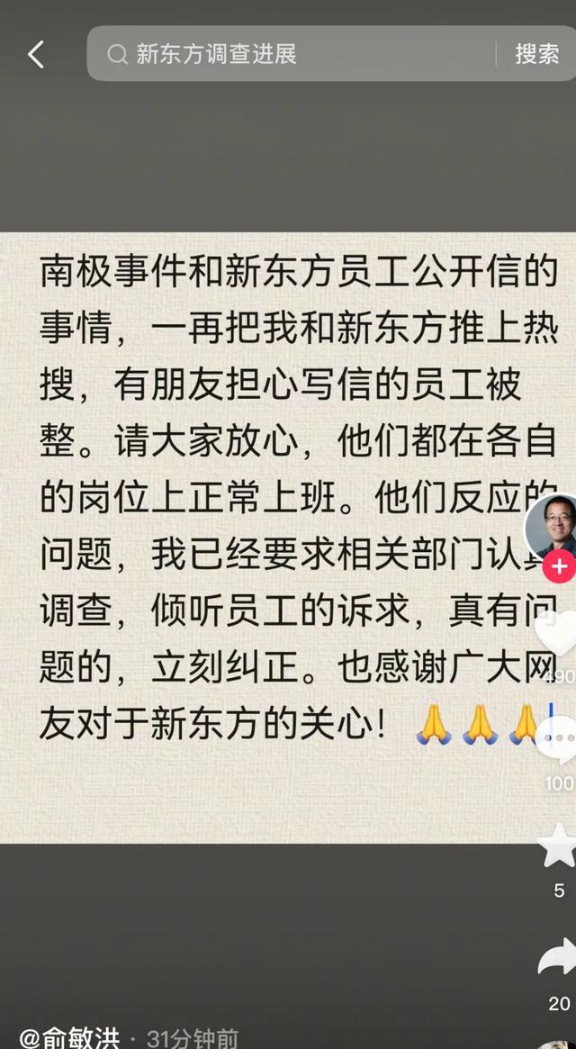 12月6日,新东方集团董事长俞敏洪发文:南极事件和新东方员工公开信的事情,一再把我和新东方推上热搜,有朋友担心写信的员工被整。请大家放心,他们都在各自的岗位上正常上班。他们反映的问题,我已经要求相关部门认真调查,倾听员工的诉求,真有问题的,立刻纠正。