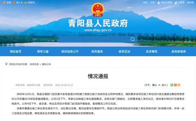 通报称,12月1日,青阳县交通部门在排查中发现省道219改建工程部分施工地块存在占用林地情况,随即要求该项目施工单位四川省交通建设集团有限责任公司所属S219项目部复绿整改。