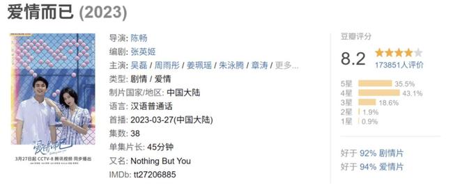 而再往前追溯一点,要说这两年口碑表现较突出的姐弟恋剧集,周雨彤和吴磊主演的《爱情而已》算是一部,目前在豆瓣维持着8.2分的不错成绩。