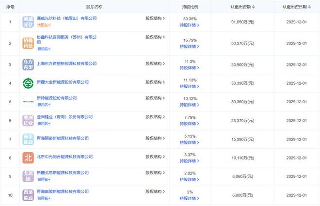 前两大股东分别为通威股份(通过子公司持股30.35%)和协鑫集团(通过子公司持股16.79%),其余股东包括新特能源、大全能源、东方希望等硅料企业,每家持股比例根据其市场份额和产能规模进行分配。