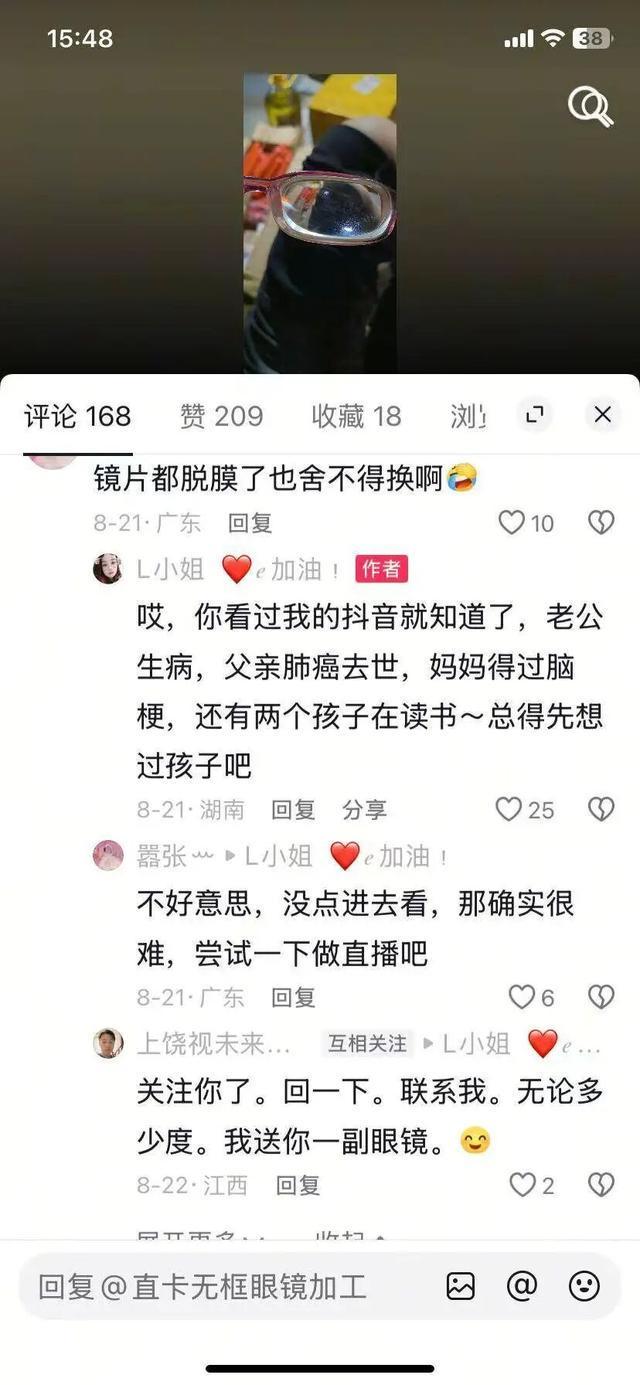 很多眼镜行业相关的网友都给她发了评论,提醒她去医院检查是不是视网膜脱落。陈一仟对她那副眼镜更为关注,当时就在评论区留言说:“联系我,无论多少度,我送你一副眼镜。”同时他还发了私信。