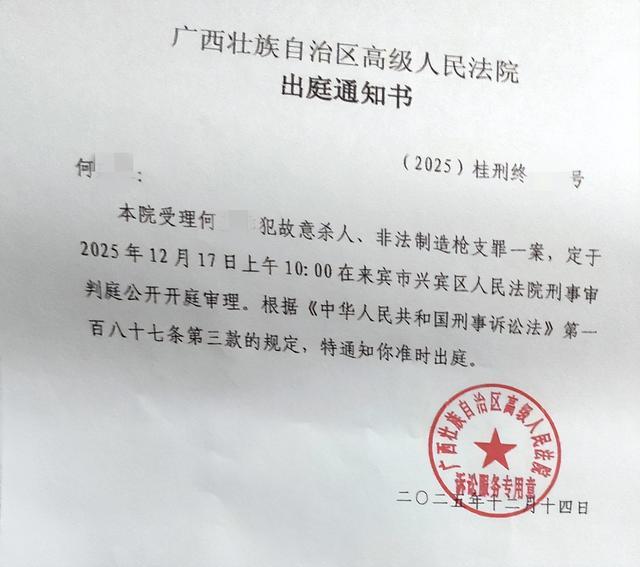 梁女士对华商报大风新闻记者称,近日他们收到了广西高级法院的出庭通知书,定于12月17日上午10时在来宾市兴宾区法院刑事审判庭公开开庭审理此案,“届时我们将出庭旁听,希望法院公平公正审理,要求判处何某死刑立即执行。”