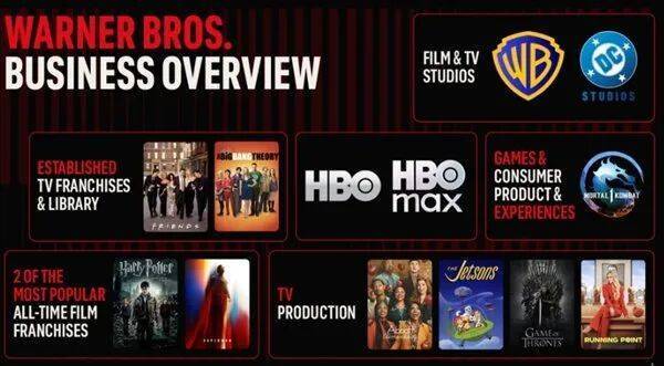 华纳业务分两大块,第一块是那些全球顶尖的电影厂牌和IP,如HBO,DC宇宙,哈利波特,权力的游戏等;第二块,包括CNN、TNT体育、Discovery频道在内的电视网业务。