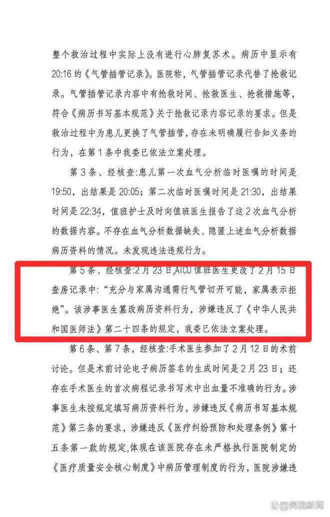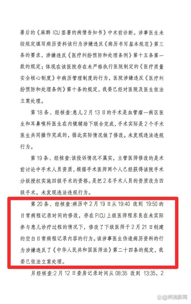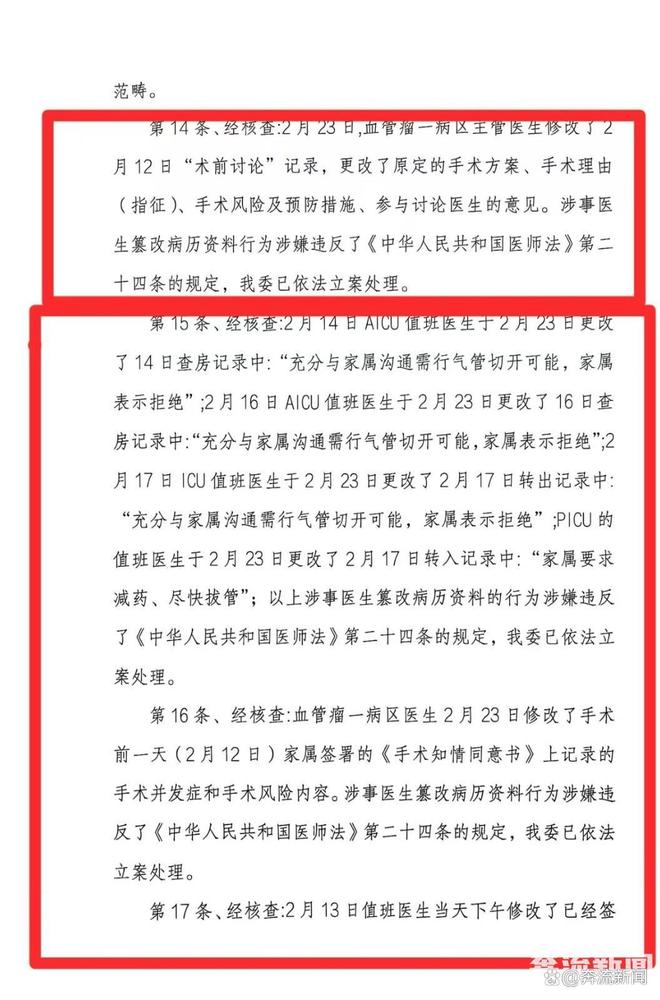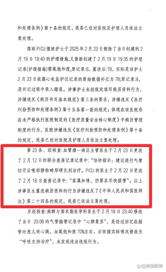 第23条显示,“经核查,⾎管瘤⼀病区主管医⽣于2月23日更改了2月12日的联合查房记录中:‘协诊指示:建议进⾏⽓管切开后喉部静脉畸形硬化剂治疗。’PICU的医⽣于2⽉22⽇更改了2⽉18⽇查房记录中:‘家属知情,仍要求尽快拔管’。以上涉事医⽣篡改病历资料的行为涉嫌违反了《中华⼈⺠共和国医师法》第⼆⼗四条的规定,我委已依法⽴案处理。”