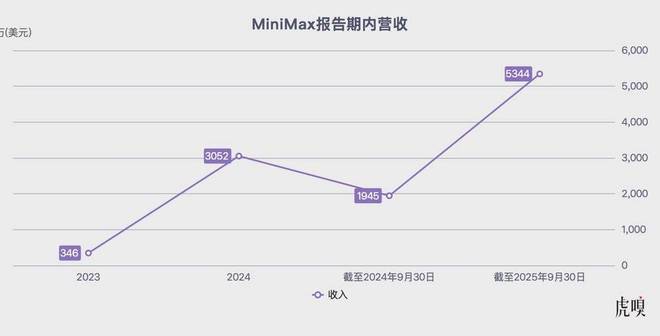 从MiniMax披露的招股书来看,前两年收入增长曲线尤为陡峭。2023年和2024年,公司营收分别为346万美元(约合人民币2436万元)和3052万美元(约合人民币2.1亿元),同比增长782.08%;截至2025年9月30日,MiniMax实现营收5344万美元(约合人民币3.77亿元),同比增长174.76%。