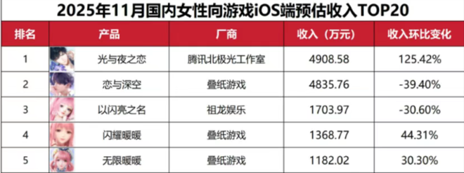 根据游戏日报统计的女性向游戏内地iOS端预估总收入榜单,《光与夜之恋》已经连续多月稳居女性向市场TOP2,11月整体收入甚至反超《恋与深空》来到了TOP1,依然表现出了相当可观的市场竞争力。