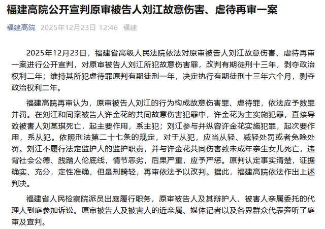 据福建高院:2025年12月23日,福建省高级人民法院依法对原审被告人刘江故意伤害、虐待再审一案进行公开宣判,对原审被告人刘江所犯故意伤害罪,改判有期徒刑十三年,剥夺政治权利二年;维持其所犯虐待罪原判有期徒刑一年,决定执行有期徒刑十三年六个月,剥夺政治权利二年。