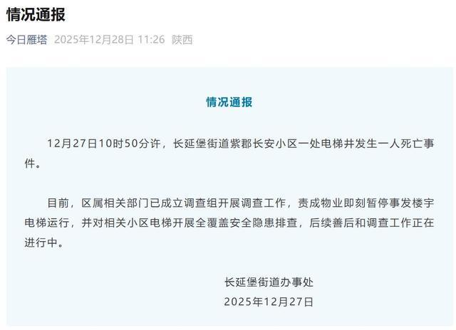 28日上午,雁塔区长延堡街道办事处发布情况通报:12月27日10时50分许,长延堡街道紫郡长安小区一处电梯井发生一人死亡事件。目前,区属相关部门已成立调查组开展调查工作,责成物业即刻暂停事发楼宇电梯运行,并对相关小区电梯开展全覆盖安全隐患排查,后续善后和调查工作正在进行中。