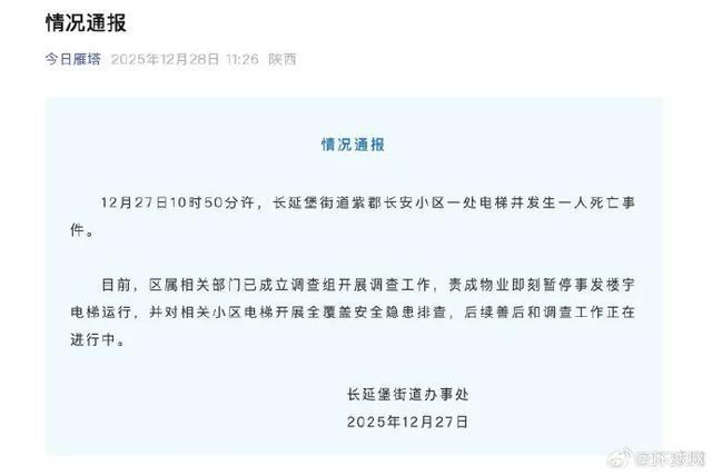 西安“今日雁塔”发布情况通报:12月27日10时50分许,长延堡街道紫郡长安小区一处电梯井发生一人死亡事件。