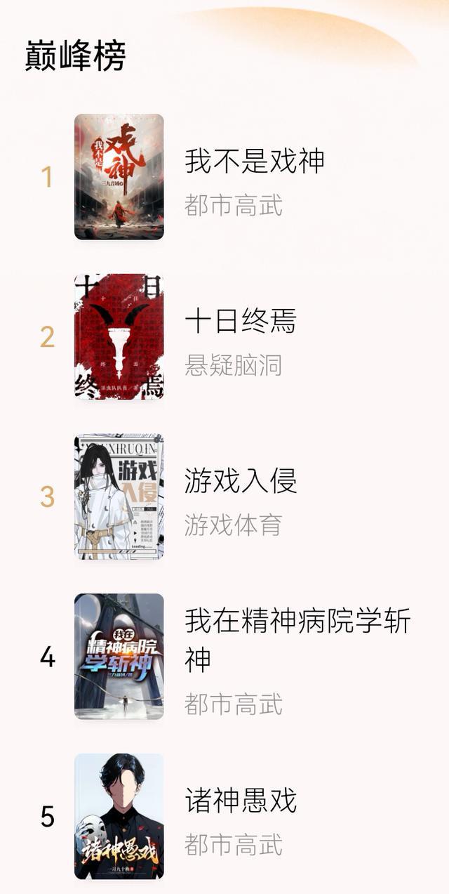 随后热心的吃瓜网友们开始频频“催更”秦海璐分享书单,她慷慨晒出《攀高枝》《末日特情处》《我在修仙界搞内卷》等不同题材小说,甚至直接圈出截图中的“巅峰榜”,告知网友们应该去哪里“挖宝”。