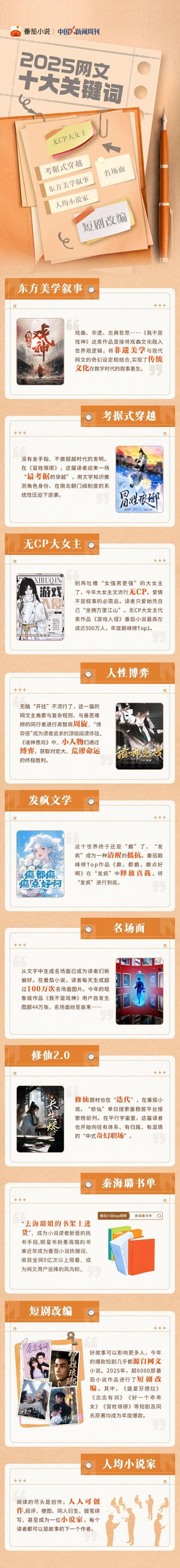 12月29日,中国新闻周刊与番茄小说联合发布《2025网文十大关键词》,结合年度爆款作品,从创作趋势、消费特点、IP产业及社会价值等多个维度,提炼出当下最能代表网络文学发展趋势的十大关键词:无CP大女主、发疯文学、考据式穿越、人性博弈、东方美学叙事、名场面、秦海璐书单、修仙2.0、短剧改编、人均小说家。