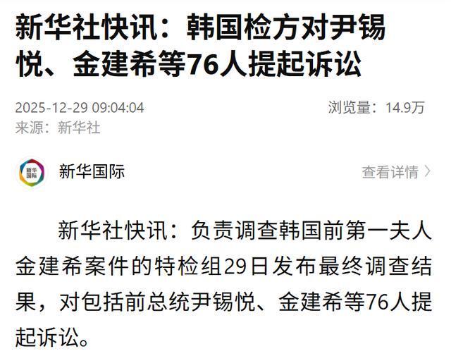 今日稍早时候,新华社快讯:负责调查韩国前第一夫人金建希案件的特检组29日发布最终调查结果,对包括前总统尹锡悦、金建希等76人提起诉讼。