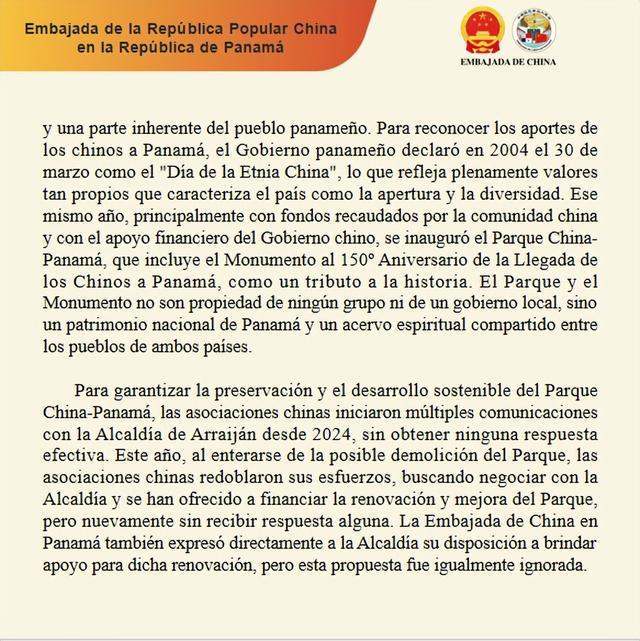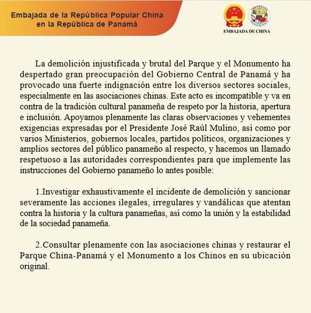公园和纪念碑遭到无理粗暴拆除,已经引起巴中央政府高度关注和社会各界尤其是华人社团的强烈愤慨。拆除行为同巴拿马尊重历史、开放包容的文化传统格格不入,背道而驰。我们完全赞同穆利诺总统和巴多个政府部门、地方政府、政党、团体,以及广大巴民众就此发表的明确意见和强烈要求,呼吁有关当局尽快采取以下措施:
