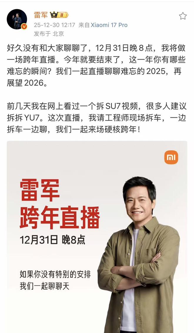 雷军还表示前几天在网上看过一个拆SU7视频,很多人建议拆拆YU7。这次直播,将请工程师现场拆,一边拆车一边聊,一起来场硬核跨年。