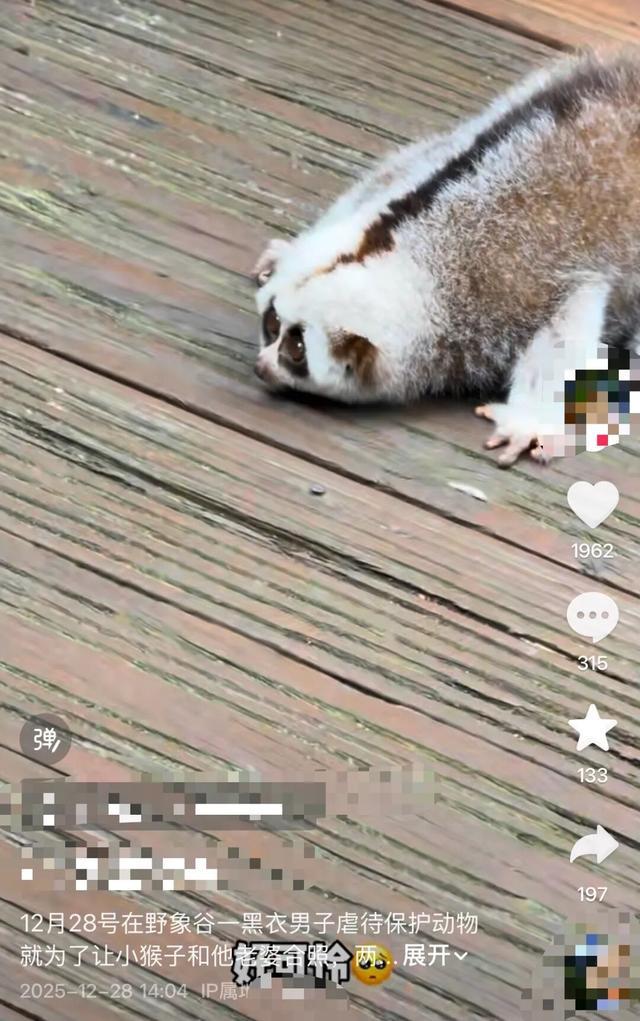 近日,有游客发视频称,一男子在西双版纳野象谷景区游玩期间,为让老婆和树上的国家一级保护动物蜂猴合照,竟然将保护动物从树上摇落摔下。
