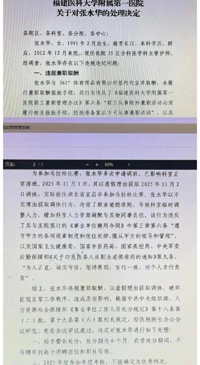 南都此前报道,近日,有网友公开了一份福建医科大学附属第一医院的内部通报。其中指出,张水华与361°体育用品有限公司签约代言并取酬,未履行兼职取酬报批手续,违反了《福建医科大学附属第一医院职工兼职管理办法》。