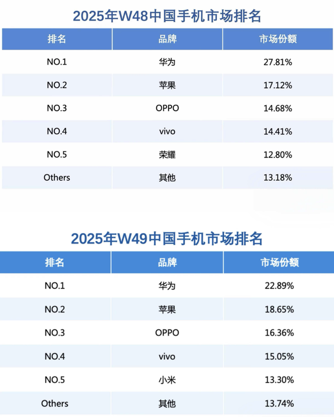 配置升维、逆势降价,结果就是发售便火爆热销,华为市场份额也在W48单周销量站上27.81%的高位。这并非一时的领先,根据此前Counterpoint Research的报告,2025年前三季度华为在600至800美元价位段以32%的份额保持中国市场第一;在800美元以上市场份额回升至30%,稳居国内高端市场前二。