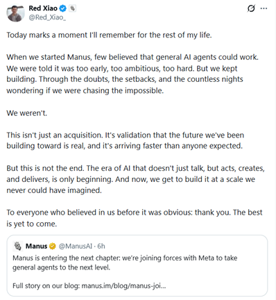 消息人士还透露,这次收购谈判在前后不过十余天内完成。在收购完成后,Manus将保持独立运营,Manus的创始人兼CEO肖弘(英文名Red)将出任Meta副总裁。