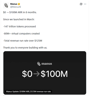 在今年12月,在下半年沉寂数月的Manus公布了一份亮眼的成绩单:上线仅仅8个月,Manus的年度经常性收入(ARR)已突破1亿美元,处理的token量超过147万亿个,并创建了超过8000万台虚拟计算机。