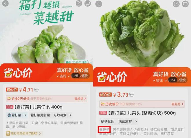 在四川地区的盒马门店里,儿菜被划分成了儿菜仔和儿菜头两种形态售卖。前者就是大家常说的“儿离开妈”,还登上霜打菜热卖榜榜首,400g售价4.71元,折算下来每斤约5.88元。后者对应着“妈带儿”的品类,售价则为3.73元一斤。