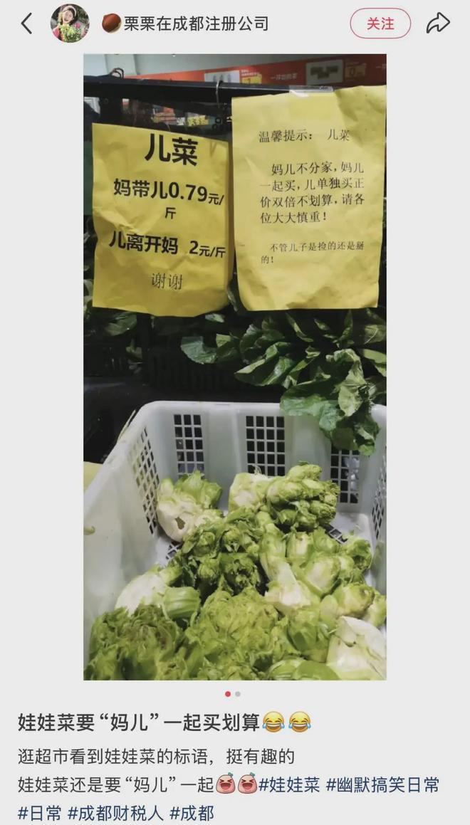 部分超市售卖的儿菜默认是“妈带儿”,同时还会附上一句“儿离不来妈”“不能全部捡儿,必须有妈”的俏皮话,如果顾客想单独买“儿”也可以,只不过得按精品价格称重。