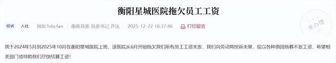 据部分网传投诉截图显示,多名自称为该院职工的发帖者诉称,自2025年6月份起,该医院未再发放工资,37人被欠薪金额达百万元,以及有员工诉称未缴纳社保。
