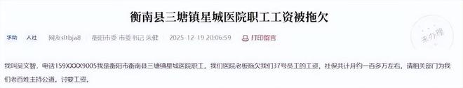 湖南衡阳民营医院欠薪百万元,官方介入协调解决