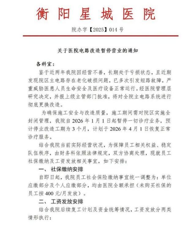 另一份疑似为该院发布的《关于医院电路改造暂停营业的通知》称,近两年来,因经营不善,该院长期处于亏损状态,为解决院区主电路老化破损问题,自2026年1月1日起,该院暂停诊疗业务,进行停业改造,工期为3个月,计划于2026年4月1日恢复正常诊疗服务,并对员工的社保缴纳、工资发放作了安排。