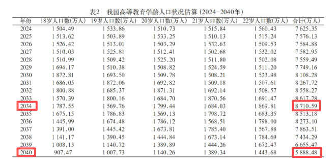 我们先看一组关键数字。根据任增元、高静、陶禹廷《面向2035:基于我国学龄人口变动的高等教育资源需求预测及配置策略》研究预测,我国高等教育学龄人口(18—22岁)将在2034年左右达到峰值,之后开始下降。到2040年,这个群体的人数可能比高峰时减少超过2800万。