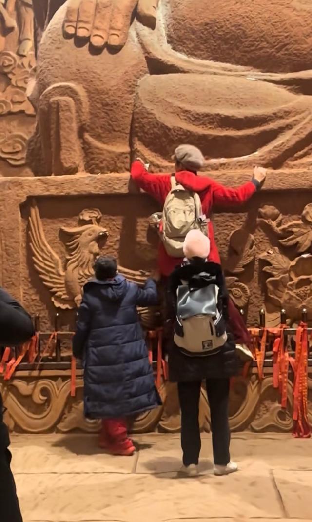 视频里,3名女子互相配合,其中一人站在旁边,疑似望风打掩护。一身穿红色上衣、背背包的女子,爬上大佛,把钱拿到后,递给旁边站着的另一名女子,这名女子接钱后,把钱揣在兜里。这个动作连续了好几次。