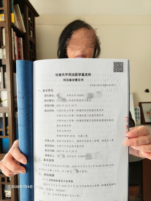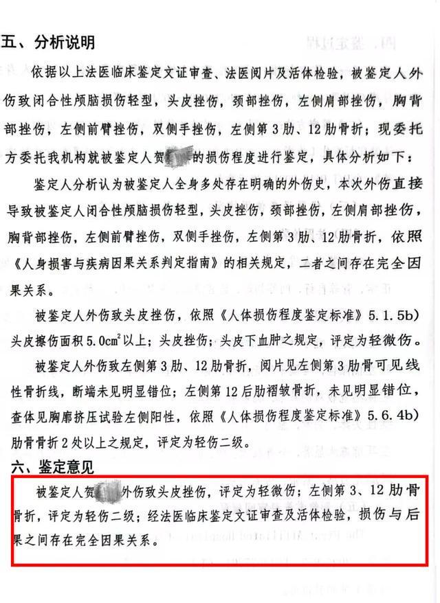 今年10月10日,她前往兰州市的甘肃天平司法医学鉴定所进行鉴定。10月27日,出具了鉴定意见书。记者看到,该鉴定机构给出的鉴定意见为,贺女士外伤致头皮挫伤,评定为轻微伤;左侧第3、12肋骨骨折,评定为轻伤二级;经法医临床鉴定文证审查及活体检验,损伤与后果之间存在完全因果关系。