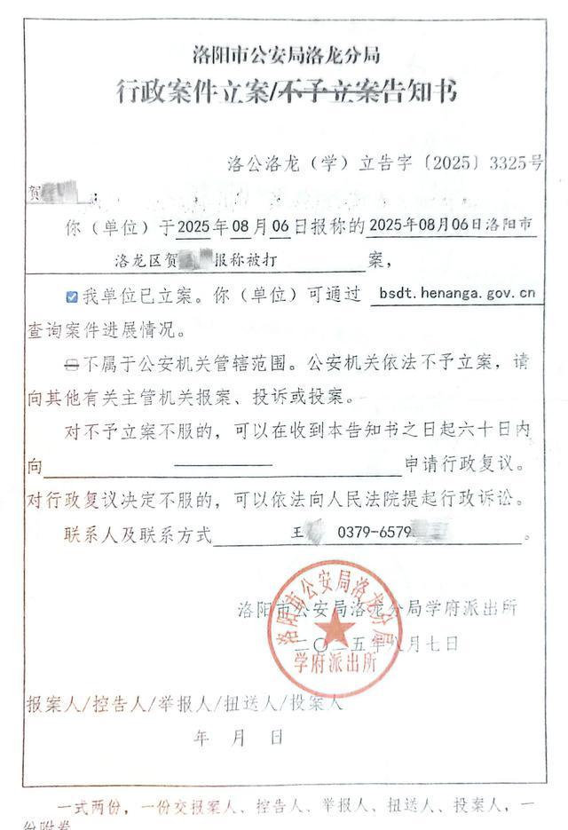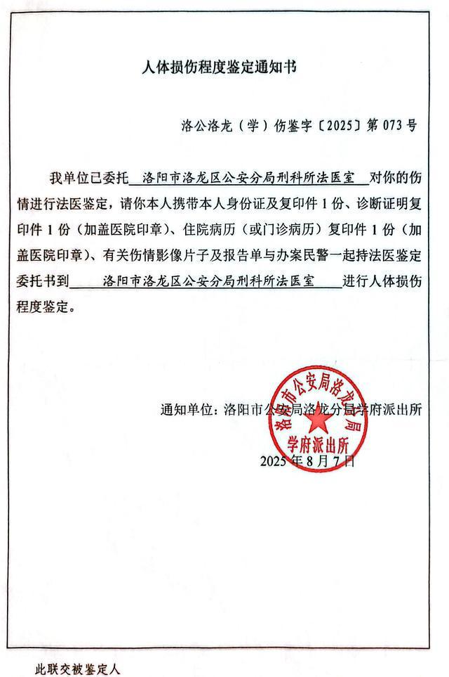 8月7日,洛阳市公安局洛龙分局学府派出所就贺女士被打一事进行行政立案调查,同时向贺女士开具了《人体损伤程度鉴定通知书》,让她到公安洛龙分局刑科所法医室进行人体损伤程度鉴定。