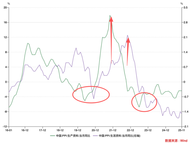 我们将PPI拆分为“生产资料”和“生活资料”两个部门,理想情况下两者之间就具有如下传导关系: