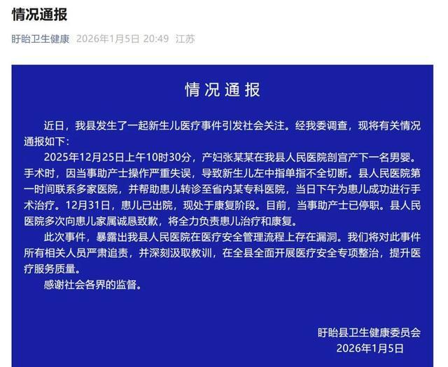 江苏盱眙县卫生健康委员会1月5日通报:近日,我县发生了一起新生儿医疗事件引发社会关注。经我委调查,现将有关情况通报如下: