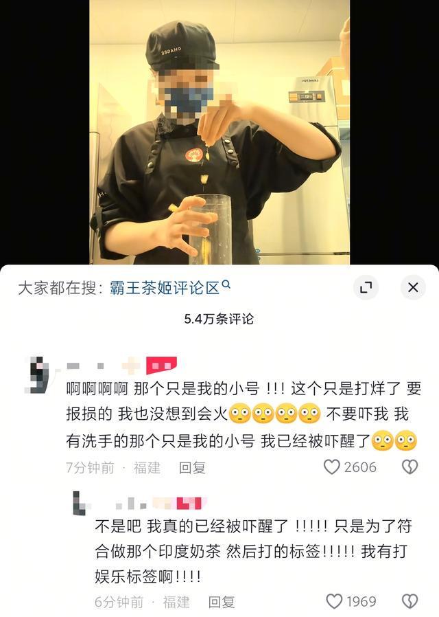 上午8:06,该女子在“印度版霸王茶姬”的评论区回复网友称:“不是吧,我真的已经被吓醒了!只是为了符合做那个印度奶茶然后打的标签!(这个视频)我有打娱乐标签啊!这个只是打烊了要报损的,我也没想到会火不要吓我,我有洗手的,那个只是我的小号。”并多次重复“已经被吓醒了”。