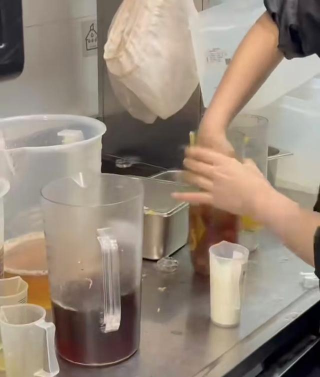 >>身穿霸王茶姬工服“用手搅拌”奶茶,身后还放着“东南亚音乐”