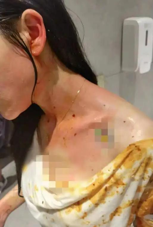 为了证实自己的说法,她给记者出示了当初事发时的照片,只见她衣服上沾着黄色油渍,身上有红肿。