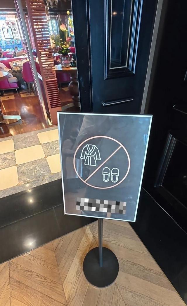 博主“李四万”发布的视频显示,酒店宴会厅门口有摆放着告示牌,疑似是告知穿拖鞋和浴袍不能入内用餐。博主指着旁边的男孩对宴会厅经理表示:“这是我的一位小朋友,他不懂(规则),你没让他进去,这也明确标明不允许穿拖鞋进入,所以他回去换了。”