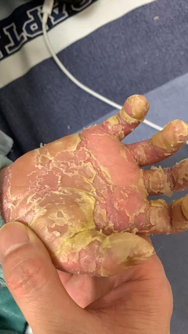 2022年10月25日,在西安交大一附院住院治疗一个月,病情刚有所缓解,年底孩子又开始呕吐腹泻,到2023年3月甚至便血,在唐都医院确诊为干细胞移植后肠道排异并发症,再次回到西安交大一附院治疗4个多月,病情才得到控制。”康先生说,2023年8月,孩子皮肤再次出红疹,蔓延全身,皮肤开始脱落,同时出现眼球发黄、小便呈深茶色的症状。住院后确诊为重度皮肤排异、肝衰竭倾向,还伴有眼球排异、口腔排异。