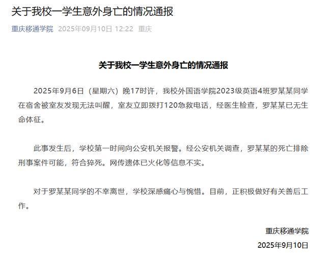 2025年9月6日(星期六)晚17时许,我校外国语学院2023级英语4班罗某某同学在宿舍被室友发现无法叫醒,室友立即拨打120急救电话,经医生检查,罗某某已无生命体征。