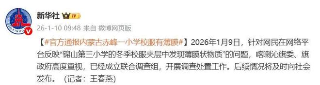 2026年1月9日,针对网民在网络平台反映“锦山第三小学的冬季校服夹层中发现薄膜状物质”的问题,喀喇沁旗委、旗政府高度重视,已经成立联合调查组,开展调查处置工作。后续情况将及时向社会发布。