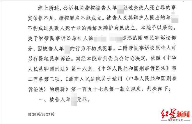 徐女士介绍,在接受警方调查时,单某称徐园系自杀。后来,单某因涉嫌过失致人死亡被提起公诉。2023年9月,一审法院认为证据不足,判决被告人单某无罪。随后,大连市普兰店区人民检察院提出抗诉,认为一审判决确有错误,适用法律错误。