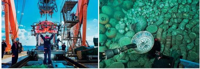 右图:文物工作者使用深潜设备对南海西北陆坡沉船遗址水下文物进行提取。 图/新华