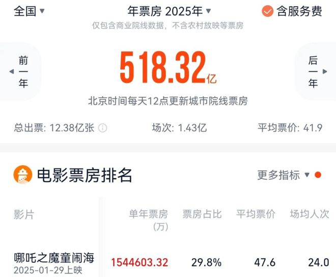 又一个反驳的观点是,如果不是《哪吒2》票房150亿,那么,2025年的整体票房绝不会达到500亿。