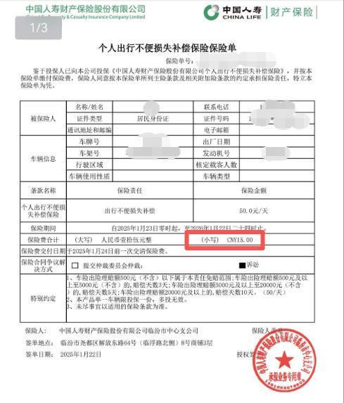 一年未出险,何先生也没有认真核对业务员发给他的保单。“直到2025年底需要续保时,才把之前的保单看了一下。”何先生说,“当初业务员给了我三份保单,一份是交强险(车船税)保单,金额950元加360元;一份是车辆商业险保单,金额2811.89元;一份出行不便损失补偿保单,金额15元。共计4136.89元。”