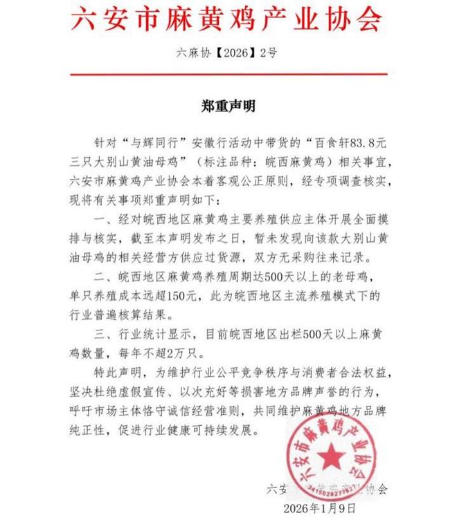 1月9日,六安市麻黄鸡产业协会发布声明,对该商品的货源、养殖成本、出货数量提出质疑。在近一个月时间里,该协会会长李书军连发多条视频喊话董宇辉。